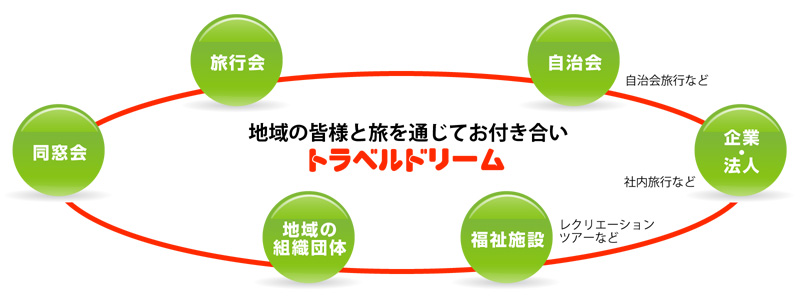 の理念のもと、地域密着型の旅行会社として営業してまいりました。旅を通じて、地域の皆様のふれあいの輪が広がり、幸せで豊かな暮らしづくりの一助になることで、私たちは地域貢献を行いたいと願っております。